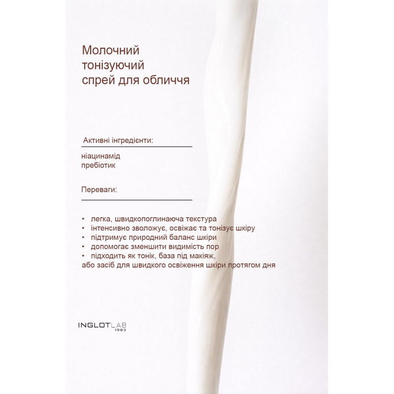 Відкрийте для себе унікальну силу цього молочного спрею, виготовленого з 98% натуральних інгредієнтів. Його легка, швидкопоглинаюча формула інтенсивно зволожує, освіжає та тонізує шкіру, відновлюючи її природний баланс. Багатство активних інгредієнтів, включаючи ніацинамід, пребіотик та екстракти центели азіатської та базиліка, збагачені олією насіння соняшнику, забезпечує шкірі комплексний заспокійливий, захисний та регенеруючий ефект. Цей косметичний засіб підтримує природний мікробіом шкіри, зменшує видимість пор, одночасно покращуючи еластичність та розгладжуючи поверхню шкіри. Легка формула створює на шкірі тонкий, нежирний захисний шар. Ідеально підходить для використання як тонік, основа під макіяж або засіб для швидкого освіження шкіри протягом дня. Комплекс натуральних рослинних екстрактів служить консервантом.